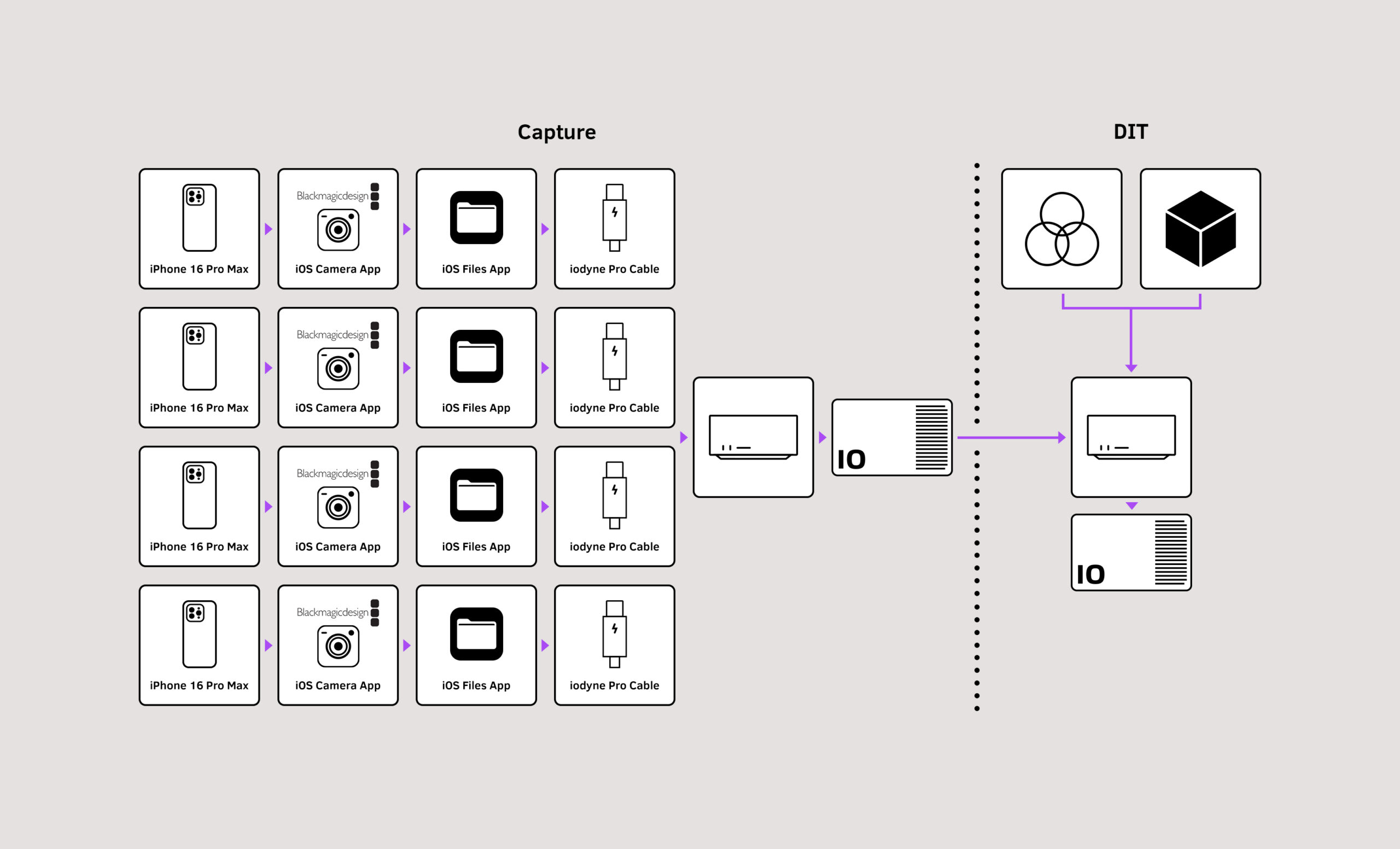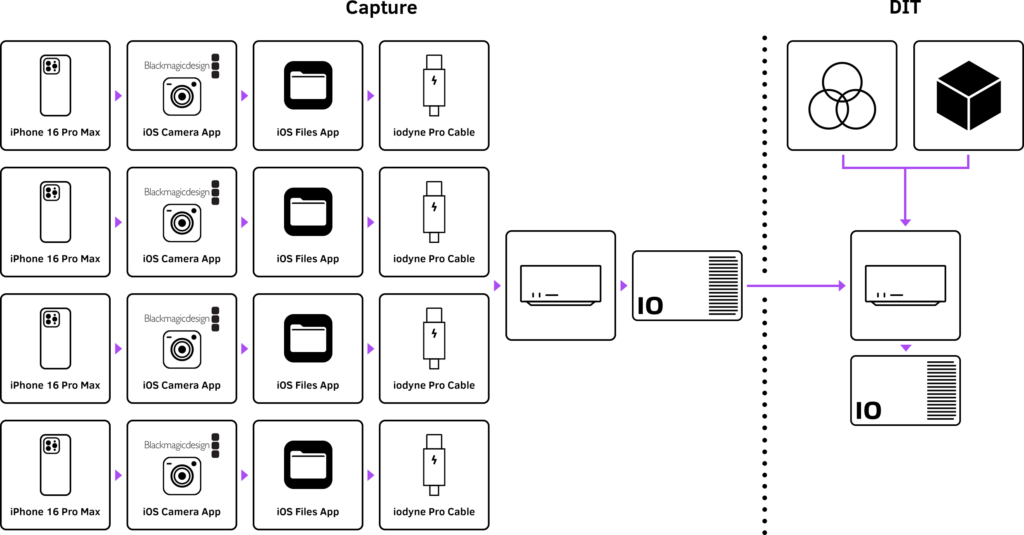 In this recipe, we’ll show you how to capture 4K ProRes from multiple iPhones simultaneously, recording straight to encrypted, RAID-protected iodyne Pro Data. No offloading required. You’ll learn how to:
